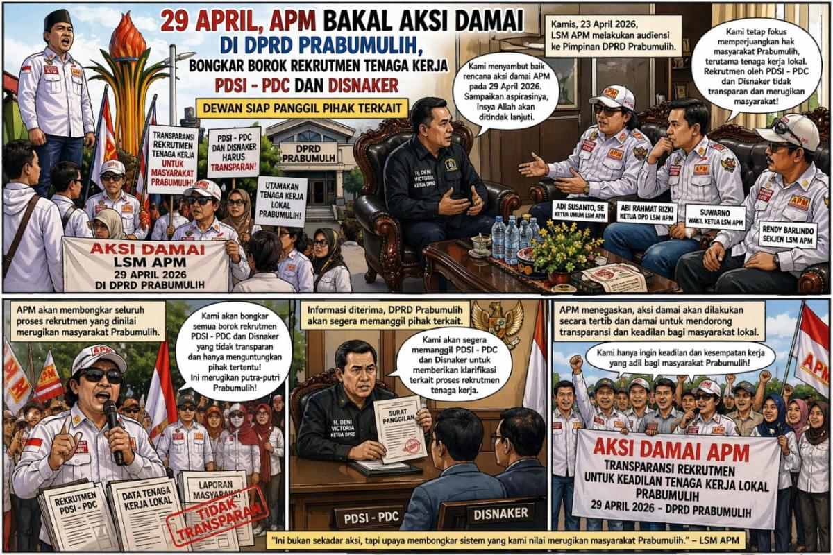 PRABUMULIH, FAJARSUMSEL.COM – Lembaga Swadaya Masyarakat (LSM) APM memastikan akan menggelar aksi damai di DPRD Prabumulih pada 29 April 2026. Aksi ini bertujuan membongkar dugaan ketidaktransparanan dalam proses rekrutmen tenaga kerja oleh PDSI–PDC bersama Disnaker.