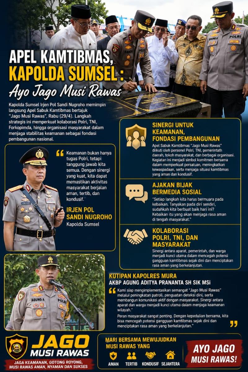 “Kami siap mengimplementasikan semangat ‘Jago Musi Rawas’ melalui peningkatan patroli, penguatan deteksi dini, serta membangun komunikasi aktif dengan masyarakat. Sinergi antara aparat dan warga menjadi kunci utama dalam menjaga keamanan wilayah,” ujar AKBP Agung.