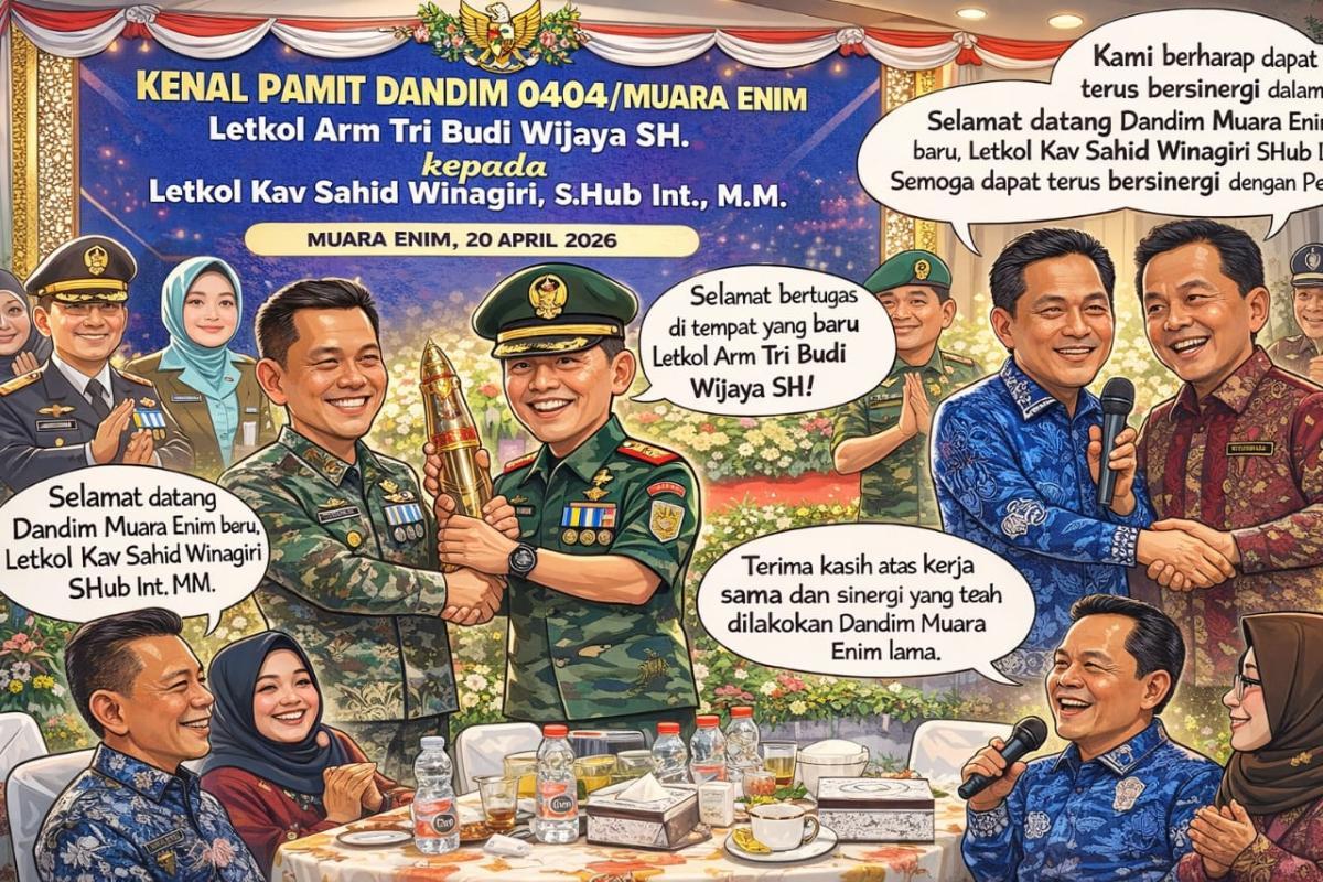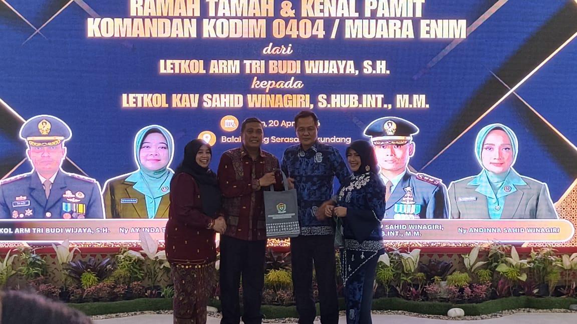MUARA ENIM, FAJARSUMSEL.COM – Suasana hangat dan penuh keakraban mewarnai kegiatan kenal pamit Komandan Kodim (Dandim) 0404/Muara Enim yang digelar di Balai Agung Serasan Sekundang, Senin (20/4/2026). Acara ini menandai serah terima kepemimpinan dari Letkol Arm Tri Budi Wijaya SH kepada Letkol Kav Sahid Winagiri SHub Int MM.