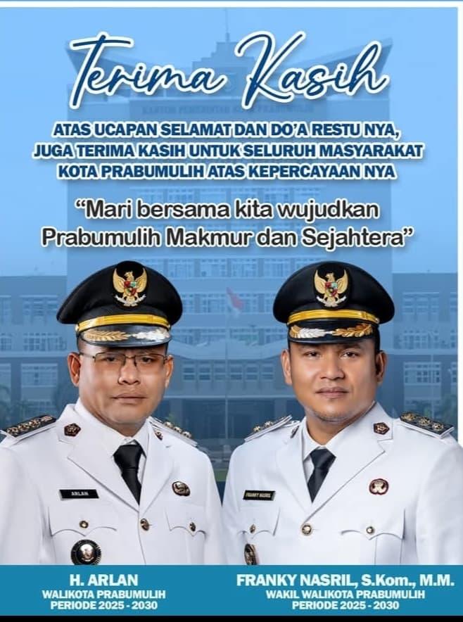 Dilantiknya, Cak Arlan dan Bang Franky sebagai Wako Prabumulih dan Wawako Periode 2025-2030. Keduanya, mengucapkan terima kasih dan mengajak masyarakat bersama mewujudkan visi misinya mewujudkan Perubahan yaitu Prabumulih makmur dan sejahtera.