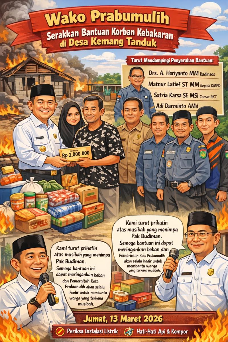 PRABUMULIH, FAJARSUMSEL.COM – Pemerintah Kota Prabumulih menunjukkan kepeduliannya terhadap warga yang tertimpa musibah kebakaran di Desa Kemang Tanduk, Kecamatan Rambang Kapak Tengah (RKT). Bantuan diserahkan langsung oleh Wali Kota Prabumulih, H. Arlan, Jumat sore (13/3/2026), sekitar pukul 16.00 WIB.