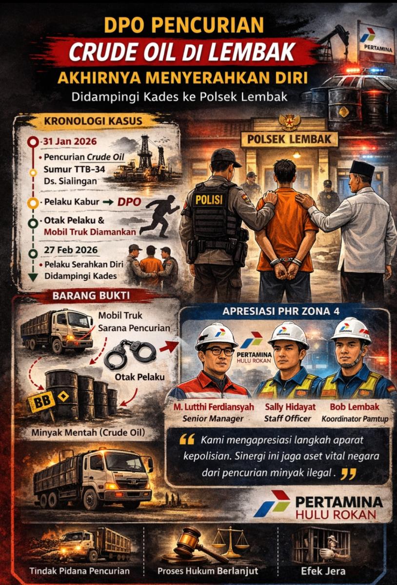 Hingga tersangka menyerahkan diri, polisi telah lebih dahulu mengamankan otak pelaku serta satu unit mobil truk yang digunakan sebagai sarana pencurian. Kendaraan tersebut kini ditetapkan sebagai barang bukti. Pengungkapan perkara terus dilakukan guna menelusuri kemungkinan keterlibatan pihak lain dalam jaringan pencurian minyak mentah tersebut.