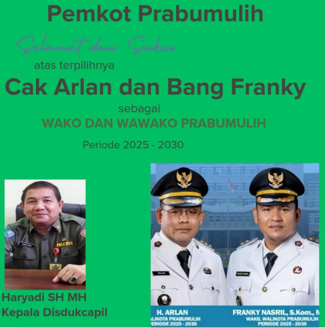 Disdukcapil Prabumulih Mengucapkan Selamat Atas Dilantiknya Cak Arlan dan Bang Franky Sebagai Wako dan Wawako Prabumulih Periode 2025 – 2030