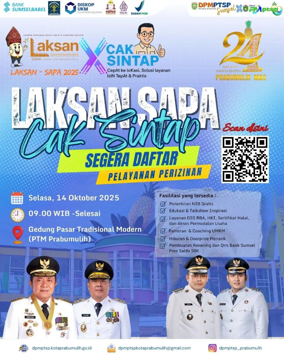 Program LAKSAN-SAPA (Layanan Perizinan untuk Publik di Sumatera Selatan / Sinergi Ajak Perizinan Awal) merupakan inisiatif DPMPTSP Provinsi Sumsel yang fokus pada penerbitan Nomor Induk Berusaha (NIB) gratis, edukasi dan konsultasi perizinan, serta pendampingan terkait OSS-RBA, Hak Kekayaan Intelektual (HKI), sertifikasi halal, dan akses permodalan usaha.