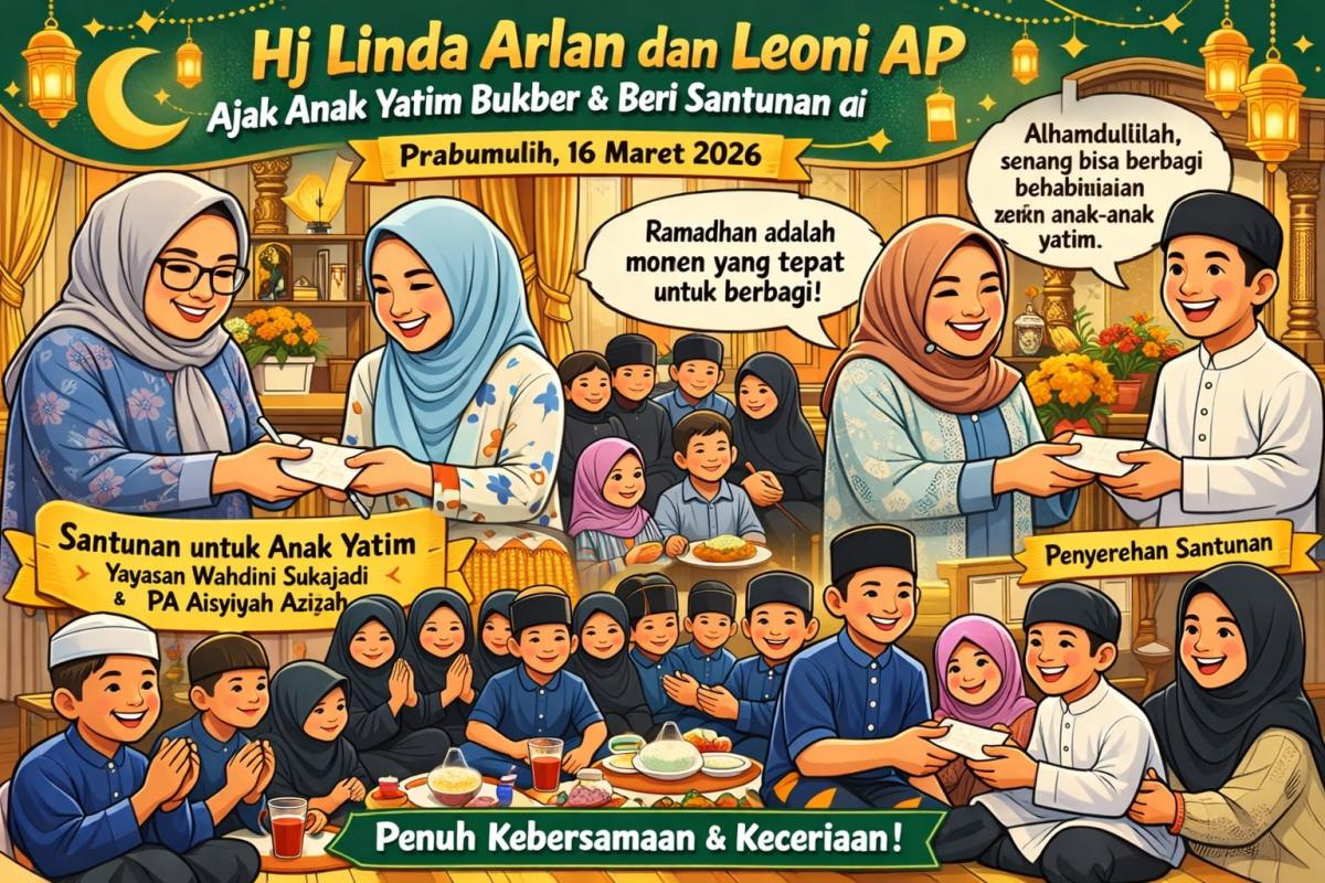 PRABUMULIH, FAJARSUMSEL.COM – Istri Wakil Wali Kota Prabumulih, Hj Linda Arlan, bersama putri sulungnya Leoni AP, SH MH yang juga Anggota DPRD Prabumulih, menggelar kegiatan buka puasa bersama (bukber) dengan anak-anak yatim di kediamannya, Senin (16/3/2026).