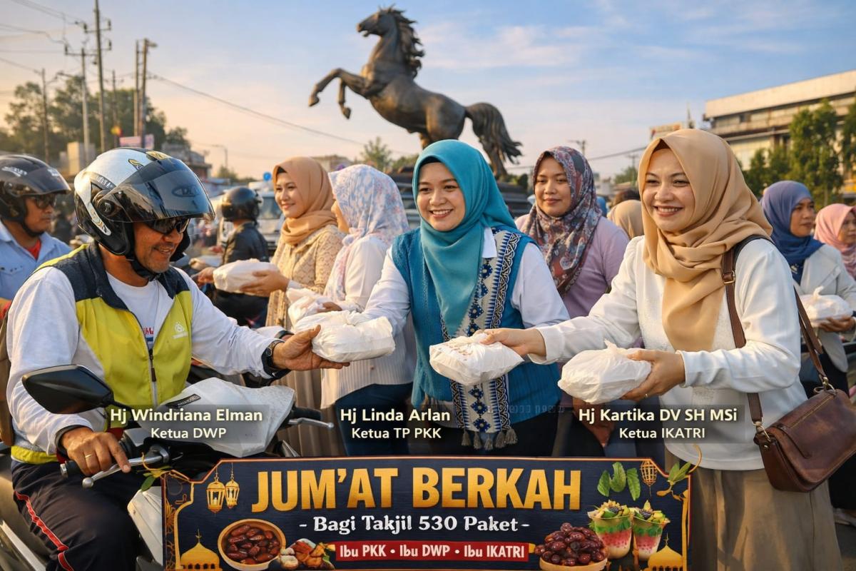 Kegiatan ini juga dihadiri oleh Ketua DWP Hj Windriana Elman serta Ketua Ikatri Hj Kartika DV SH MSi, yang turut langsung membagikan takjil kepada warga.
