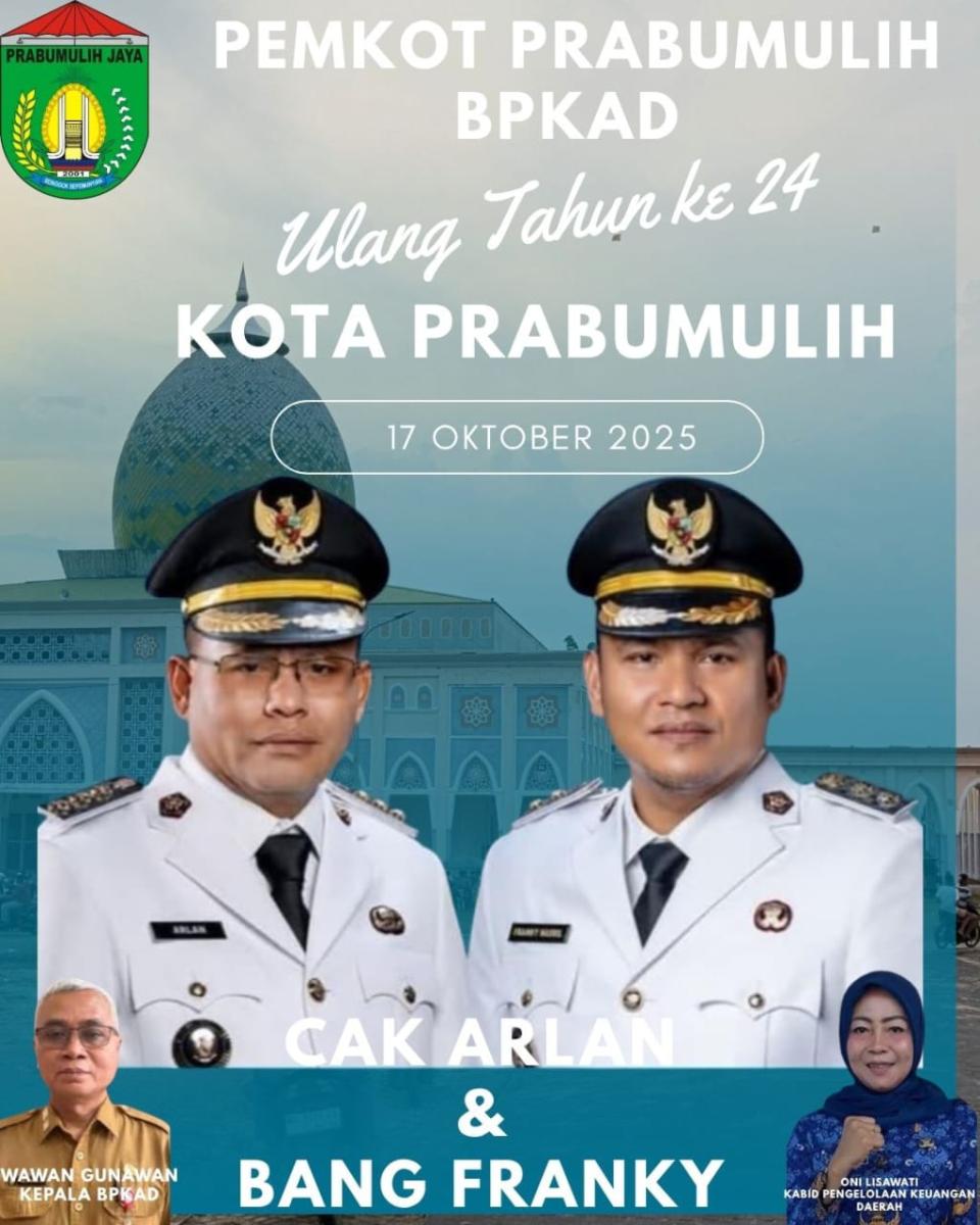 Beranda Ucapan Kabid Pengelolaan Keuangan Daerah BPKAD Prabumulih Selamat Hari Jadi Prabumulih ke 24 Ucapan Kabid Pengelolaan Keuangan Daerah BPKAD Prabumulih Selamat Hari Jadi Prabumulih ke 24Fajar Sumsel13 Oktober 2025 Semoga Prabumulih, Senantiasa Maju Dibawah Kepemimpinan Cak Arlan dan Bang Franky Mari Kita Wujudkan Perubahan Menuju Prabumulih Makmur dan SejahteraBaca JugaSegenap Jajaran BPKAD Prabumulih Mengucapkan Selamat Hari Raya Idul Fitri 1447 H/2026 M, Minal Aidin Wal Faizin, Mohon Maaf Lahir BatinApriansyah ST MH, Anggota DPRD Prabumulih, Ketua F Golkar Mengucapkan Minal Aidin Wal Faizin, Mohon Maaf, Lahir Batin, Idul Fitri 1447 H/2026 MDinas PUPR Prabumulih Mengucapkan Selamat Idul Fitri 1447 H/2026 M, Mohon Maaf Lahir BatinSegenap Jajaran DKP Prabumulih Mengucapkan Selamat Idul Fitri 1447 H/2026 M, Mohon Maaf Lahir BatinDPMPTSP Prabumulih Mengucapkan Selamat Idul Fitri 1447 H/2026, Mohon Maaf Lahir BatinJajaran Inspektorat Prabumulih Mengucapkan Selamat Hari Raya Idul Fitri 1447 H/2026