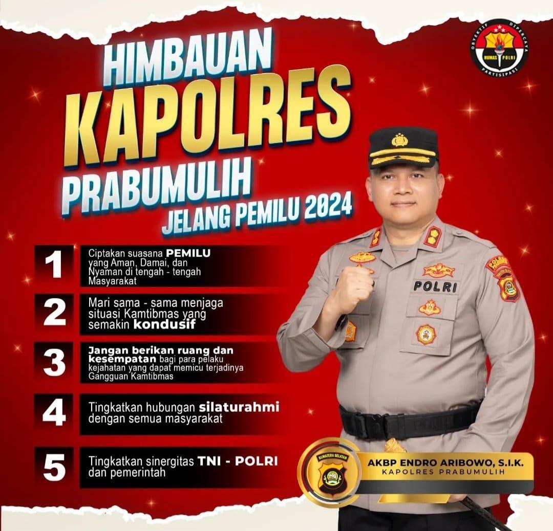 Kapolres Prabumulih, AKBP Endro Aribowo SIk memberikan sejumlah imbauan. Antara lain; mengajak masyarakat menciptakan Pemilu 2024 aman, damai dan nyaman.