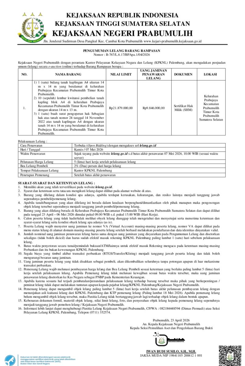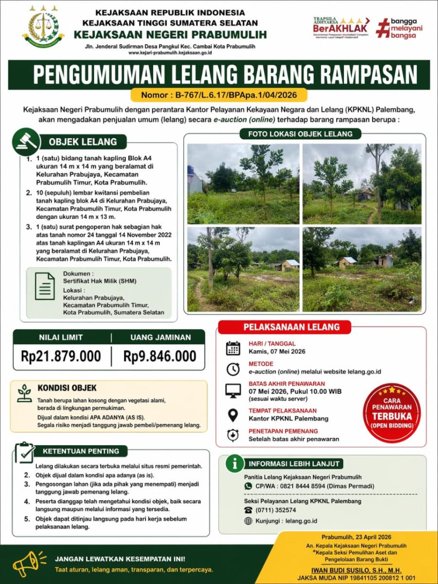 PRABUMULIH, FAJARSUMSEL.COM – Kejaksaan Negeri (Kejari) Prabumulih kembali melelang barang rampasan negara berupa sebidang tanah kapling yang berada di kawasan Kelurahan Prabujaya, Kecamatan Prabumulih Timur.