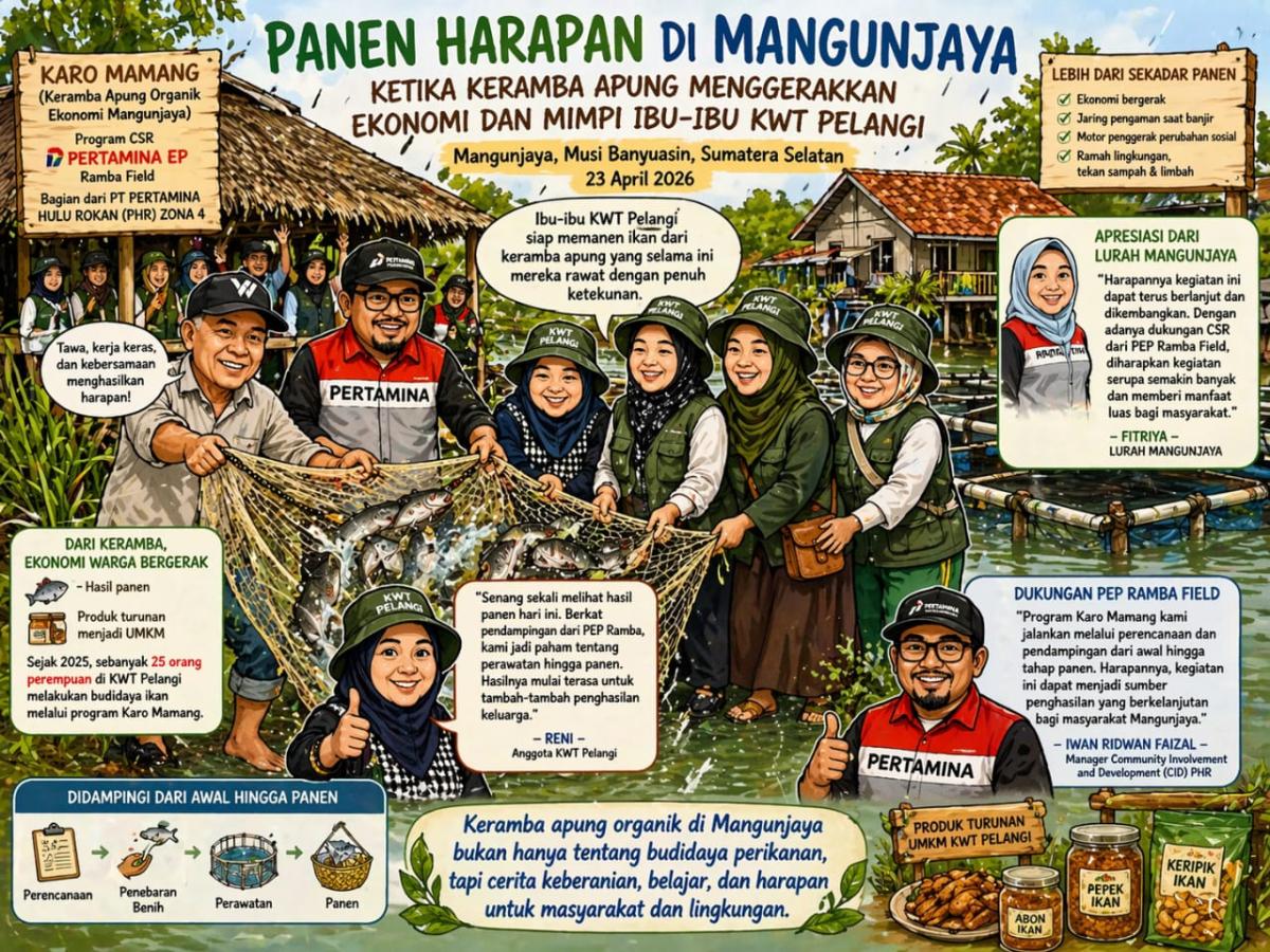 Sejak 2025, sebanyak 25 perempuan di KWT Pelangi menjalani budidaya ikan melalui program Karo Mamang (Keramba Apung Organik Ekonomi Mangunjaya). Program ini merupakan inisiatif dari Pertamina EP Ramba Field yang berada di bawah PT Pertamina Hulu Rokan Zona 4.