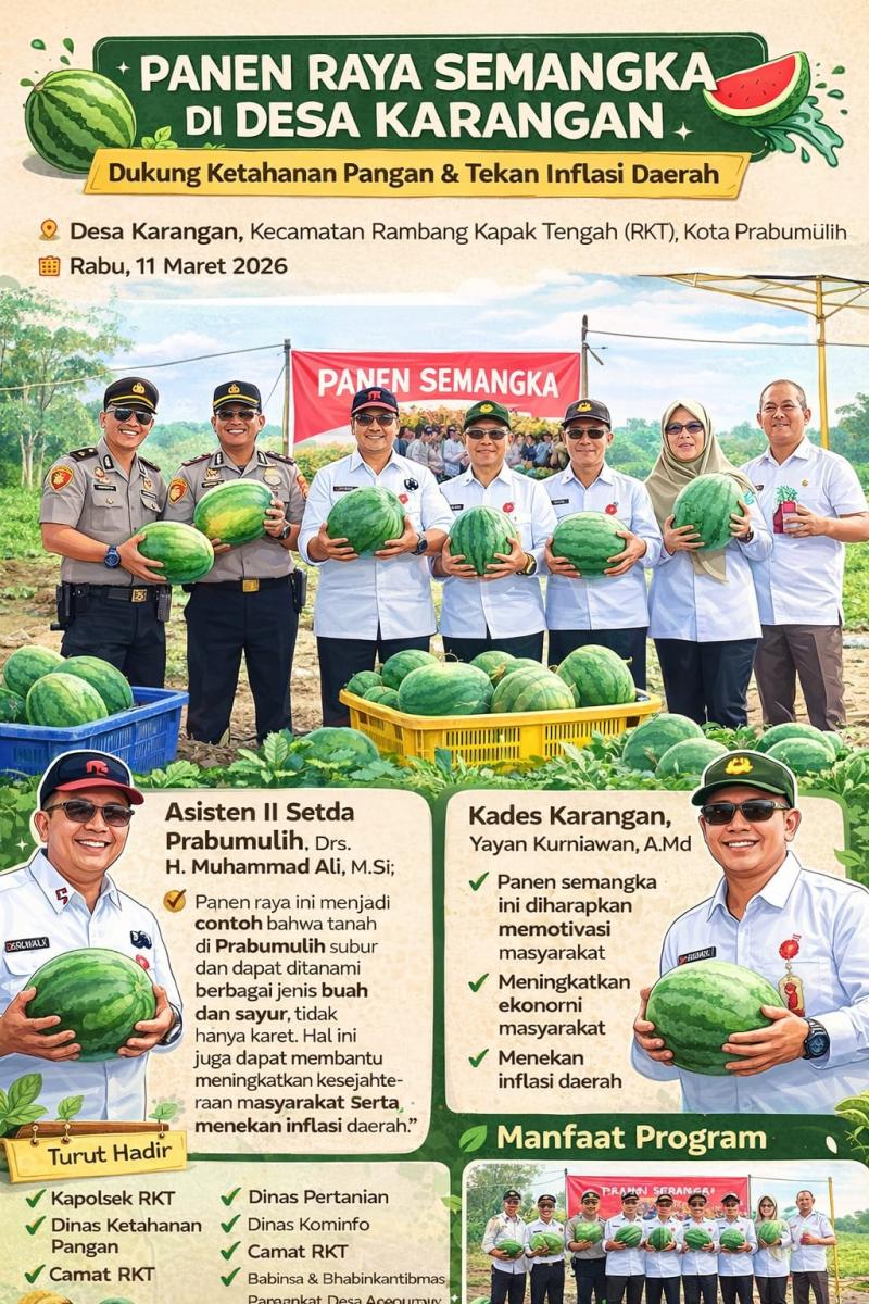 PRABUMULIH, FAJARSUMSEL.COM – Asisten II Setda Kota Prabumulih, Drs. H. Muhammad Ali, M.Si menghadiri kegiatan Panen Raya Semangka Ketahanan Pangan yang dilaksanakan di Desa Karangan, Kecamatan Rambang Kapak Tengah (RKT), Rabu, (11/3/2026).