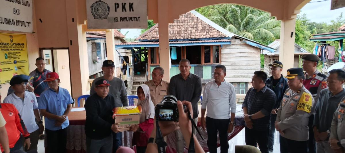 BANTU : Wako Prabumulih, H Arlan dan Wawako, Franky Nasril SKom MM bersama jajaran menyerahkan bantuan banjir kepada masyarakat Kelurahan Payuputat, Minggu. Foto : Rian/FAJARSUMSEL.COM
