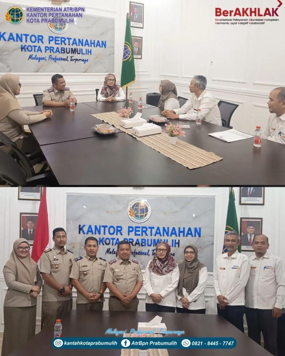 PRABUMULIH, FAJARSUMSEL.COM – Kepala Kantor Pertanahan Kota Prabumulih, Joni Efendi, S.H., M.Kn., menerima kunjungan Kepala Kantor Pelayanan Pajak (KPP) Pratama Kota Prabumulih, Niken Evi Suryani, SST., Ak., M.Ak., Ph.D., beserta jajaran, Senin, (6/4/2026).