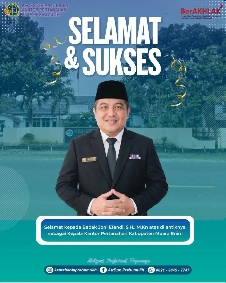 “Benar, saya mendapat amanah baru sebagai Kepala Kantah Muara Enim. Mohon doa agar dapat menjalankan tugas dengan baik di tempat yang baru,” ujar Joni.