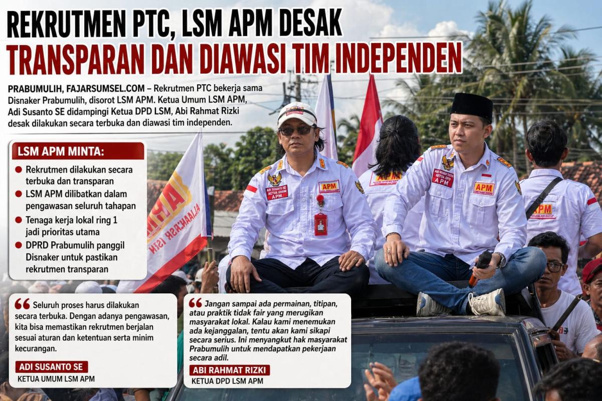 PRABUMULIH, FAJARSUMSEL.COM – Proses rekrutmen tenaga kerja PTC yang bekerja sama dengan Dinas Tenaga Kerja (Disnaker) Kota Prabumulih mendapat sorotan dari LSM APM. Organisasi tersebut mendesak agar seluruh tahapan seleksi dilakukan secara transparan dan diawasi oleh tim independen.