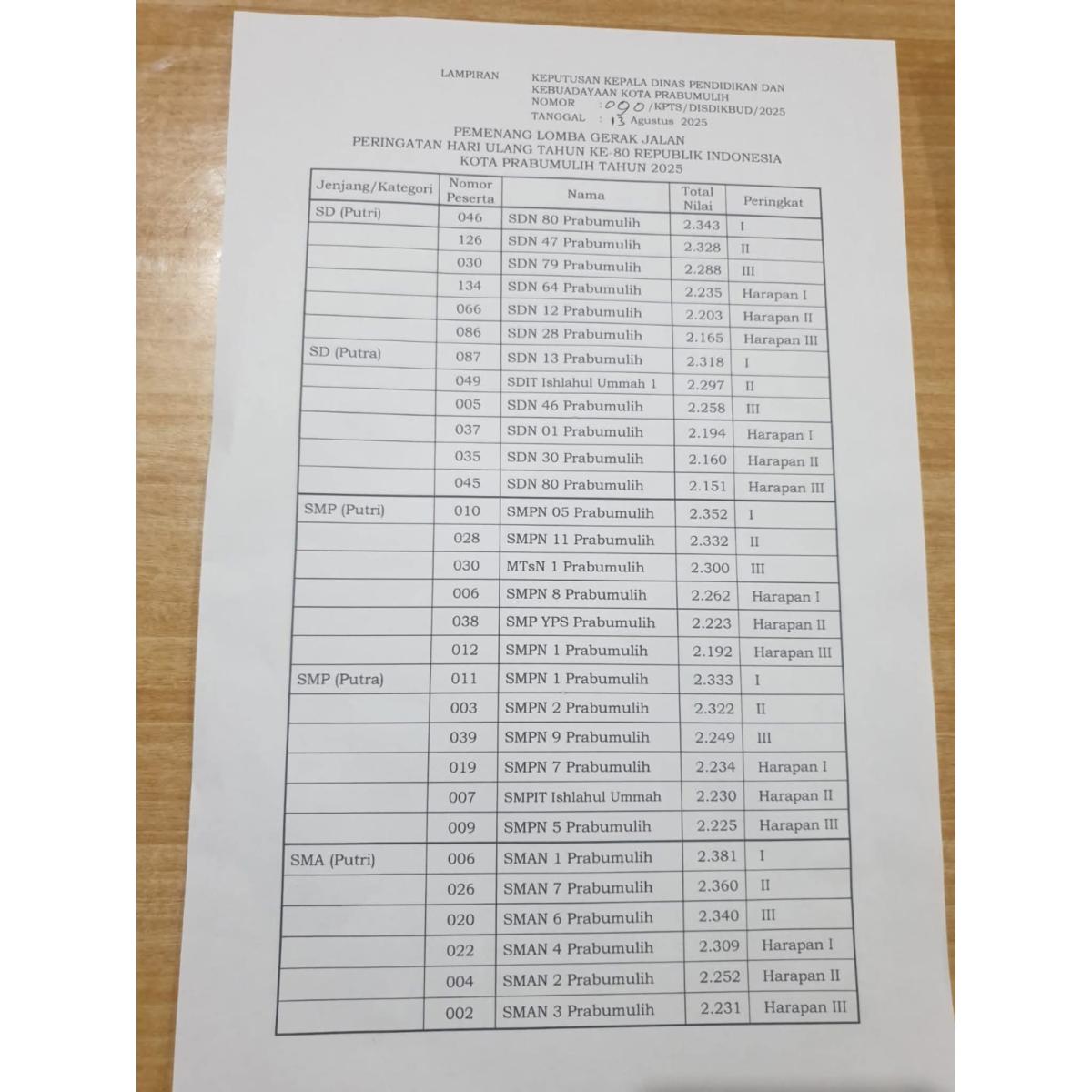 Daftar Pemenang Lomba Gerak Jalan HUT RI ke-80 Kota Prabumulih Tahun 2025