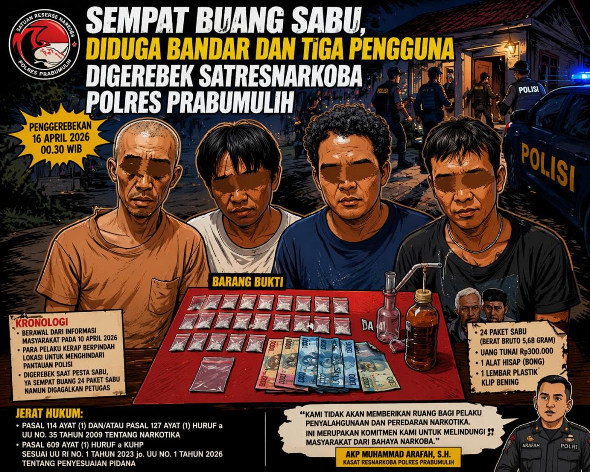 PRABUMULIH, FAJARSUMSEL.COM – Satuan Reserse Narkoba (Satresnarkoba) Polres Prabumulih kembali menunjukkan komitmennya dalam memberantas peredaran narkotika. Empat pria yang diduga terlibat dalam penyalahgunaan sabu berhasil digerebek di sebuah rumah di Jalan Masjid Nurul Falah, RT 02 RW 04, Kelurahan Sidogede Utara, Kecamatan Prabumulih Utara, Kamis (16/4/2026) dini hari.