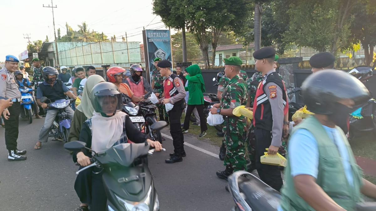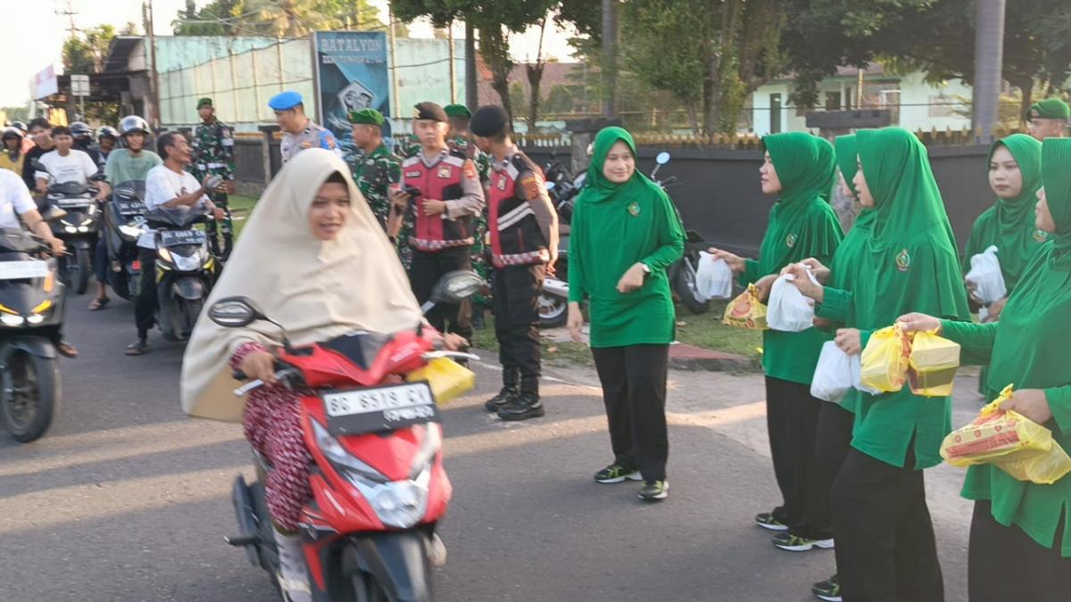 Ketua Persit KCK Yonzipur 2/SG, Nindi Ibnu Muntaha bersama jajaran turun langsung membagikan takjil gratis sebanyak 100 buah kepada pengguna jalan.