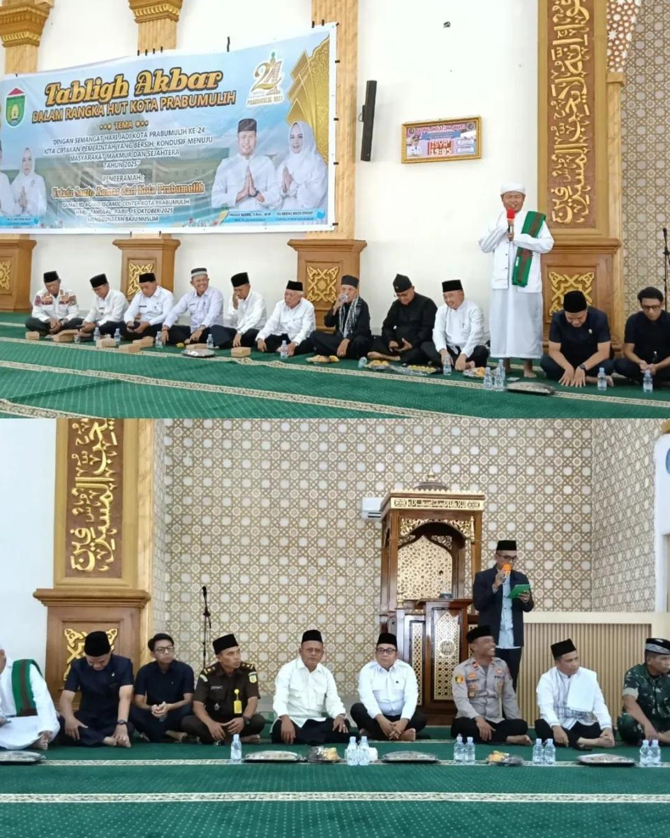 PRABUMULIH, FAJARSUMSEL.COM — Memperingati Hari Ulang Tahun (HUT) Kota ke-24 Prabumulih, Pemkot Prabumulih melalui Bagian Kesejahteraan Rakyat (Kesra) menggelar Tabligh Akbar berlangsung khidmat dan penuh makna di Masjid Jami Islamic Center Prabumulih, Rabu, (15/10/2025).