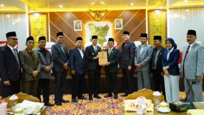 PENGESAHAN : Pj Wako Prabumulih, H Elman ST MM bersama Pimpinan DPRD dan disaksikan Anggota…