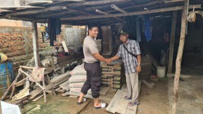 BANTU : Personel Polsek Prabumulih Barat, Bripka Wendy Kurniawan SPsi MH menyerahkan bantuan bahan bangunan…