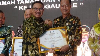 PENGHARGAAN: Pj Wako Prabumulih, H Elman ST MM menerima penghargaan Kota INI GENTING diserahkan Kepala…