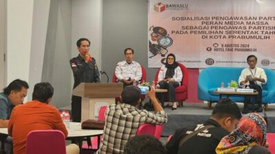 SOSIALIASI : Ketua Bawaslu Prabumulih, Afan Sira Oktrisma menyampaikan sambutannya dalam kegiatan sosialisasi bersama awak…