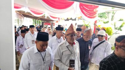KONFRENSI PRESS : Ketua DPC Gerindra Prabumulih, Aryono didampingi Sekretaris, Riza Ariansyah dan Bendahara, Ade…