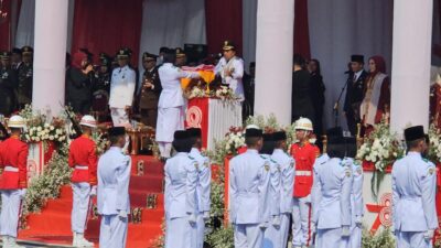 PENAIKAN BENDERA : Wako Prabumulih, Ir H Ridho Yahya MM menyerahkan bendera duplikat buat dikibarkan…