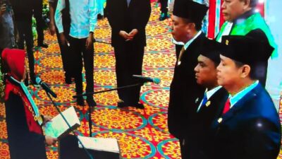SUMPAH : Ketua PN Prabumulih, RA Asriningrum Kusumawardani SH MH mengambil sumpah dan janji Pimpinan…