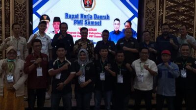 RAKERDA : Ketua PWI Sumsel, Kurniadi ST menyampaikan sambutannya dalam Rakerda 2024 di Rumdin Wako…