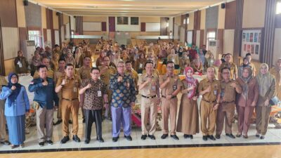 PASANG : Sekda Prabumulih, Elman ST MM memasang tanda peserta sosialisasi penyusunan Sasaran Kinerja Pegawai…