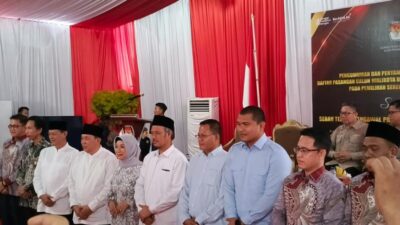 PERTEMUAN : Ketua KPU Prabumulih, Marta Dinata SST bersama Komisioner dan Forkompinda bertemu tiga Paslon…