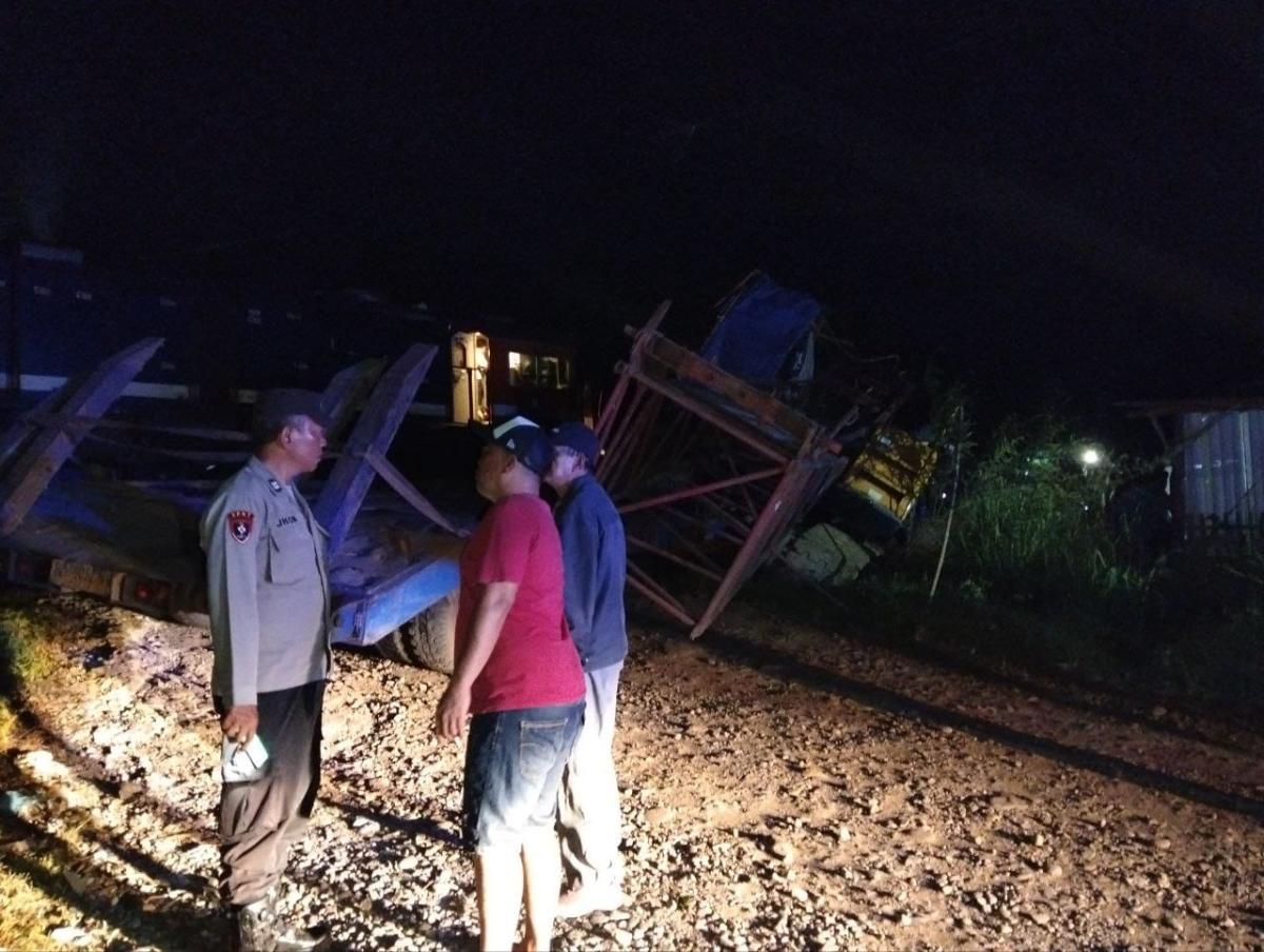 Saat melintasi rel kereta api, gandengan belakang truk tersangkut di rel. Sopir bersama kernet dan penumpang segera turun untuk meminta bantuan ke pihak perusahaan tujuan.