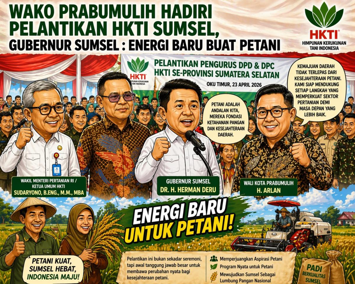 MARTAPURA, FAJARSUMSEL.COM — Wali Kota Prabumulih Arlan menghadiri pelantikan Kepengurusan Dewan Pimpinan Daerah (DPD) dan Dewan Pimpinan Cabang (DPC) Himpunan Kerukunan Tani Indonesia se-Provinsi Sumatera Selatan yang berlangsung penuh semangat dan optimisme, Kamis, (23/4/2026).