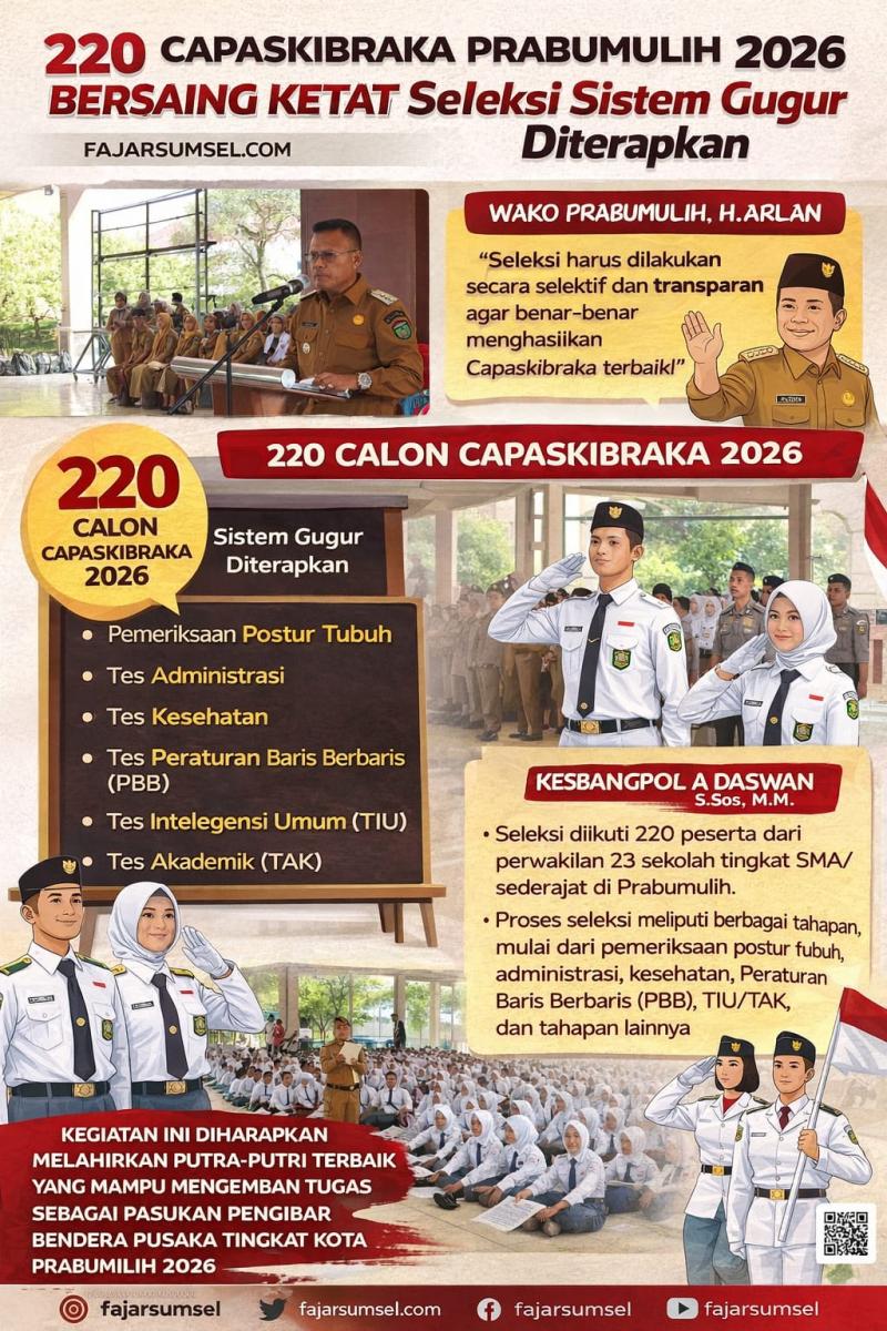 PRABUMULIH, FAJARSUMSEL.COM – Sebanyak 220 calon Pasukan Pengibar Bendera Pusaka (Capaskibraka) Kota Prabumulih tahun 2026 mulai bersaing ketat dalam proses seleksi yang digelar Badan Kesatuan Bangsa dan Politik (Kesbangpol), Senin, 20 April 2026.
